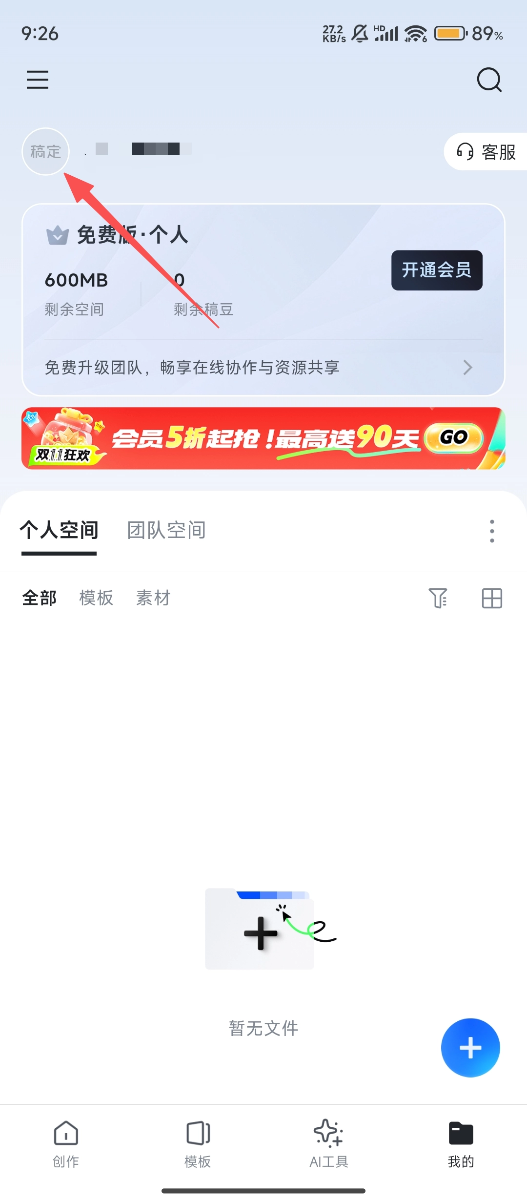 1、打开稿定设计App,点击【我的】页面左上角的【稿定】标识,就能进入个人设置界面啦。