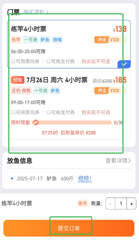 4、在钓点页面搜索到目标钓点后,进入对应的购买界面,选择所需的门票,点击提交订单按钮。