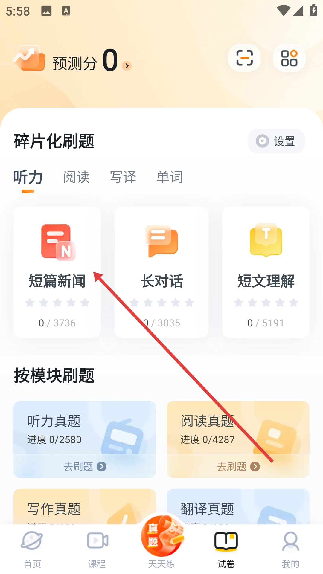 2、在刷题界面找到并选择【短篇新闻】这一题型,随后进入该题型的练习页面。