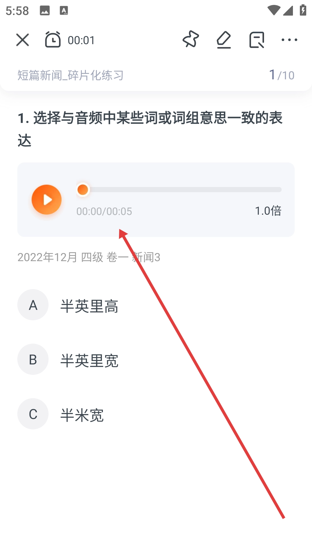 4、在答题界面播放音频,依据题目要求挑选正确答案,完成短篇新闻听力的练习。