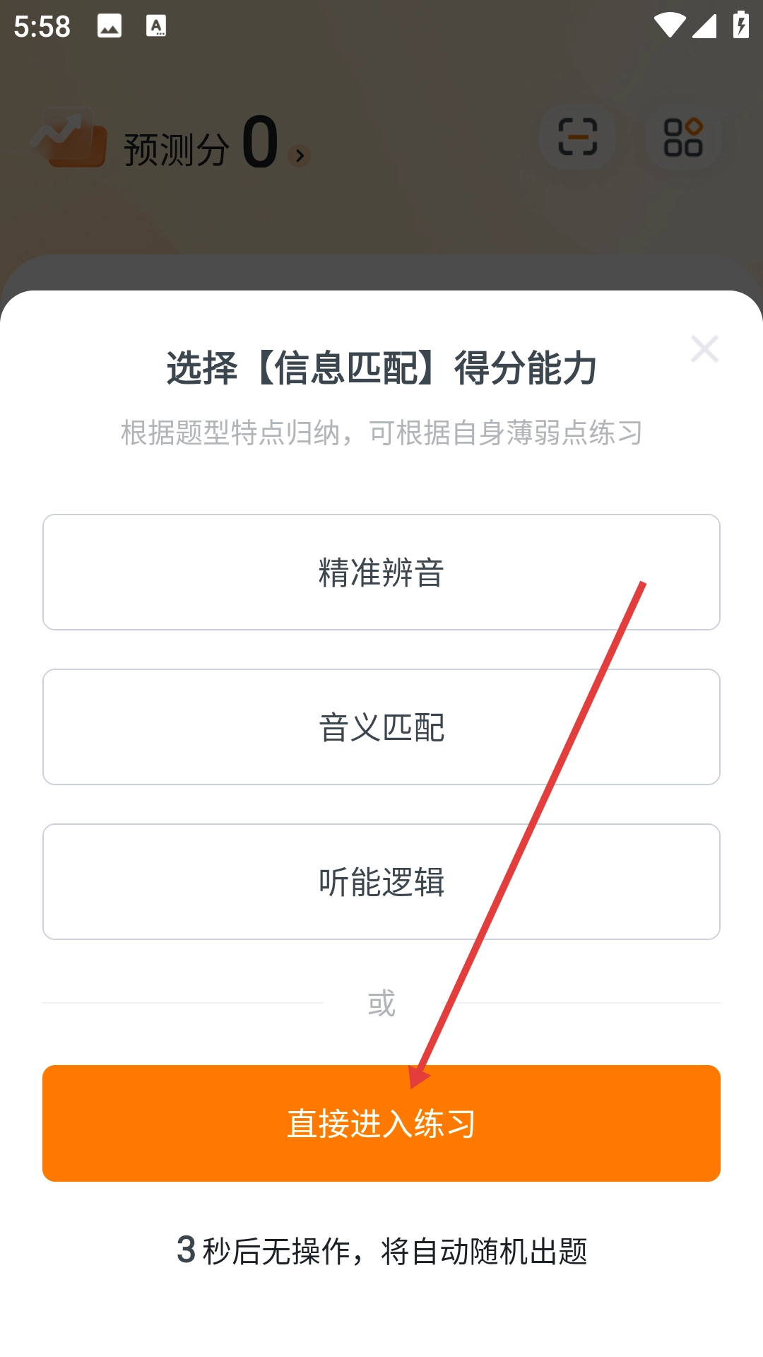3、在题型练习页面点击【直接进入练习】按钮,即可进入答题准备界面。