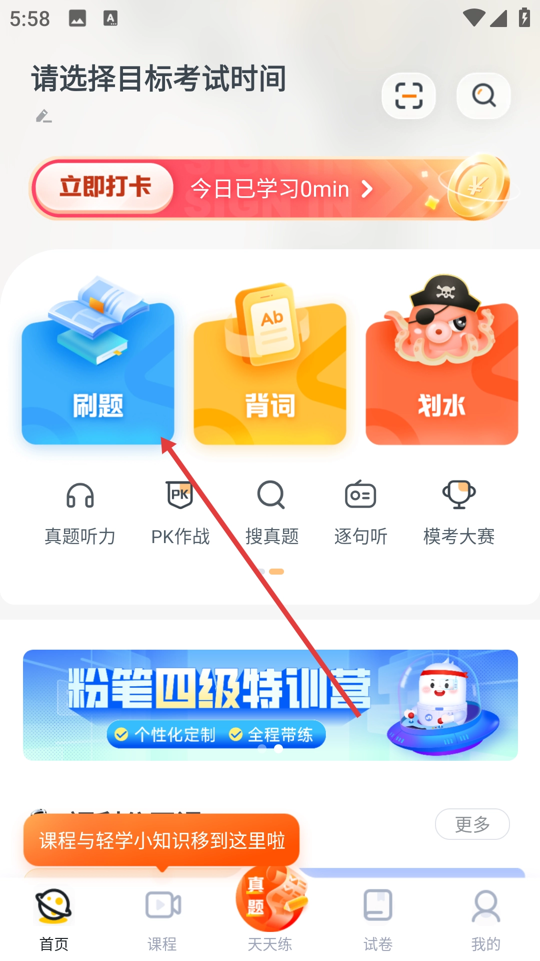 1、点击【刷题】功能入口,进入刷题界面。