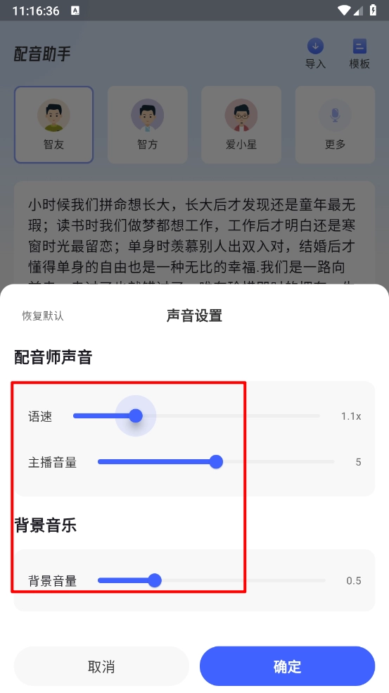 3、然后进入声音设置中选择语速、主播音量、背景音量,点击"确定"。