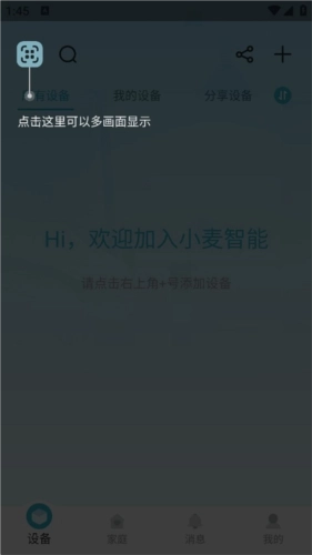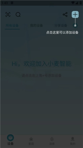 1、如图所示,当用户顺利完成注册并登录小麦智能后,即可在此处添加设备。
