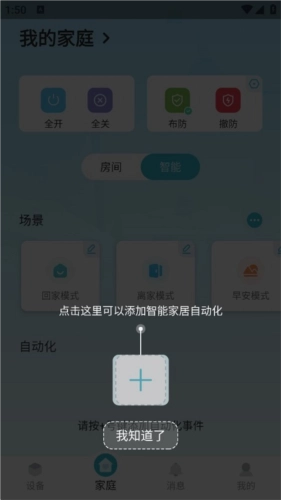 打开后,点击导航栏中的“家庭智能”板块,选择“自动化”选项,接着创建一条新的自动化规则,依次填写“触发条件”和“执行动作”的相关内容,最后启用该自动化,就能让你自定义的自动化规则正式生效了。
