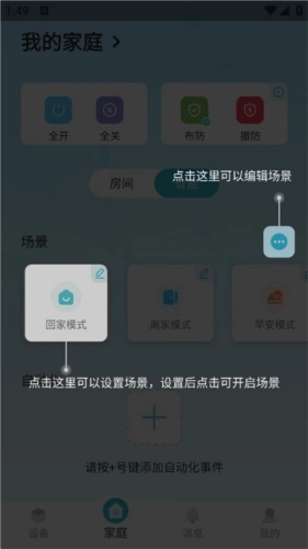 4、在熟悉设备设置后,可通过底部的家庭导航栏,依据图中展示的功能选项,对场景进行编辑与设置;完成设置后,点击对应选项即可开启该场景。