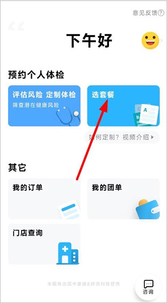 4、预约个人体检时,既可以选择定制体检或套餐类目,也能查询所在城市的体检门店,之后点击套餐即可完成体检预约。