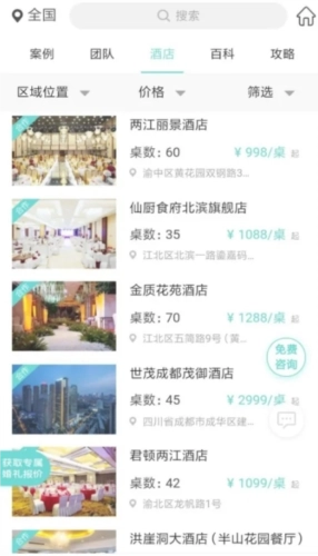 4、还能查看婚宴酒店,平台上有上千家酒店可供在线挑选、对比优劣,你可以预约心仪的酒店深入沟通,足不出户就能完成相关事宜。