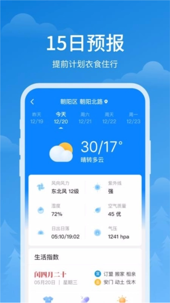 6、十五日天气预报,方便提前规划衣食住行,同时可查看配套的生活指数,助力你便捷生活;