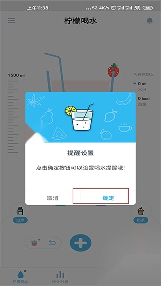 1、第一次使用这款柠檬喝水软件时,启动软件后会自动弹出“提醒设置”界面,点击“确定”按钮就能开始进行相关设置了。