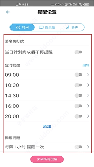 2、用户能够依据自身需求自定义设置时间提醒,当然也可以选择关闭所有提醒。