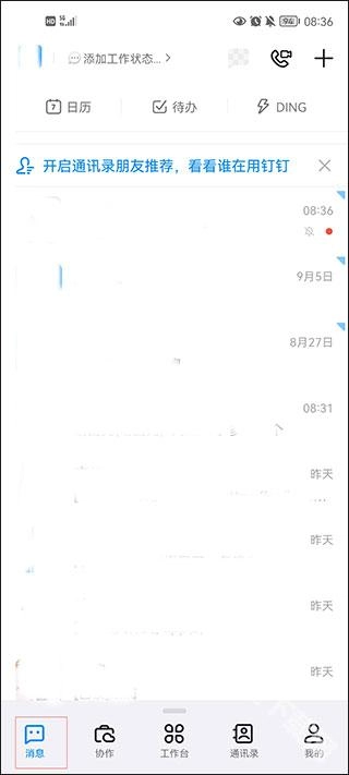 在本站安装并运行软件后,会看到消息、文档、工作台、通讯录和发现这五个板块。其中,消息板块内包含了日历、待办、ding以及最近联系人等功能。