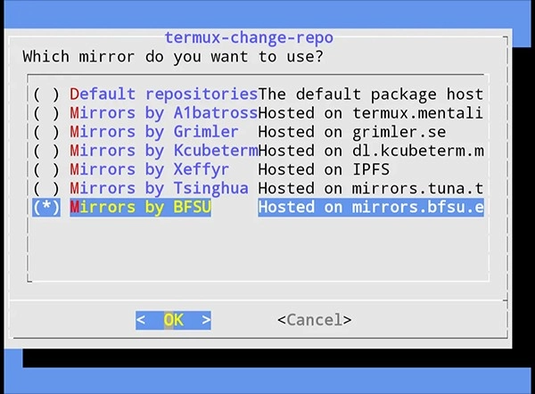 下面以更换清华大学开源软件镜像源为例,在Termux里运行termux-change-repo命令,即可进入对应的图形操作界面(界面样式可参考下方示意图)。