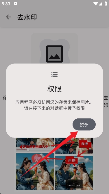 挑选一个功能模块进入并开启使用流程,例如去除视频或图片上的水印。就像界面展示的那样,第一步需要按照系统提示,为应用程序开放必要的权限设置。