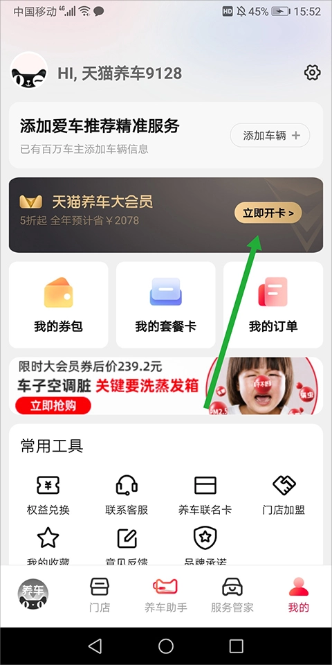 想要申请加盟的话,可以进入天猫养车的【我的】页面,然后点击【门店加盟】选项。