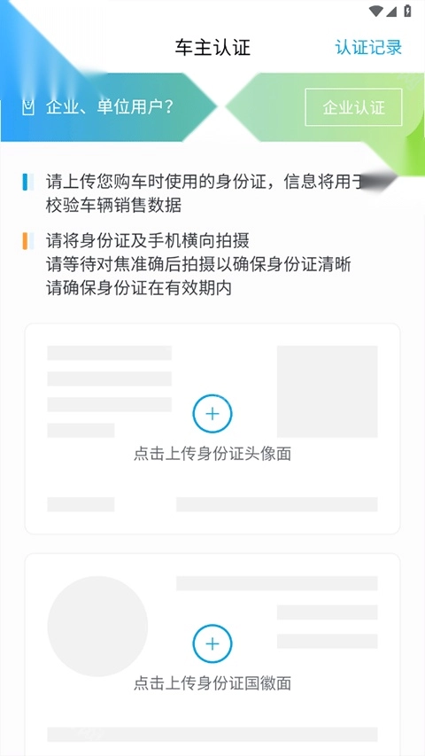 按照要求上传购车时所用的身份证,再点击提交认证就可以了