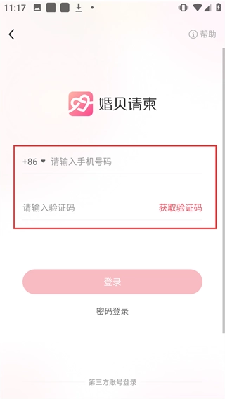 在婚贝请柬的登录界面填写手机号码,获取验证码并输入完成登录操作后,就能接着进行婚礼邀请的制作了。