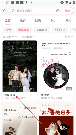 在婚礼邀请模板列表里点击【皆是浪漫】模板,就能进入模板预览页面啦。