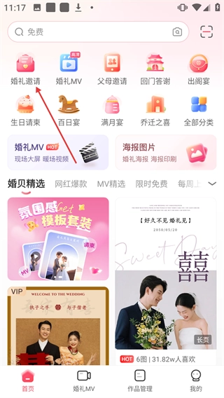 在婚贝请柬的首页找到并点击【婚礼邀请】按钮,即可进入婚礼邀请模板的选择页面。