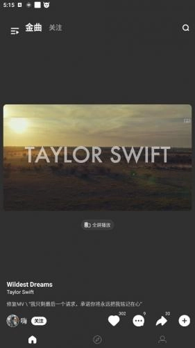 若用户打开的界面未显示“全屏播放”按钮,可通过左右滑动操作调出该按钮。2. 点击屏幕任意区域,会弹出菜单选项,在右上方找到“TV”图标,音悦台将自动搜索投屏设备,待连接成功后,即可将MV投屏至电视或其他智能硬件设备。