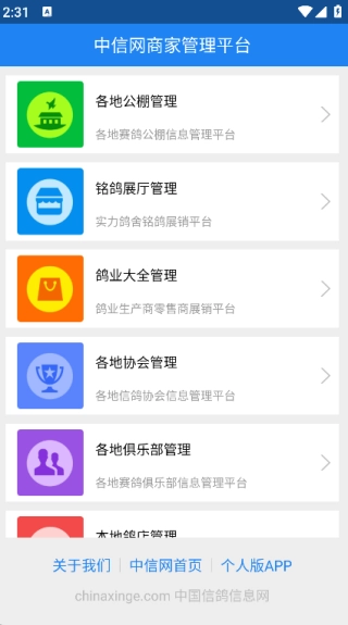 中信网商家管理平台是专门为赛鸽行业打造的专业信息管理平台。该平台整合了赛鸽行业的各类资源,能够为公棚、铭鸽展厅、鸽业大全、各地俱乐部、协会以及鸽舍等提供全方位的管理支持,是赛鸽爱好者与从业者的实用帮手。
