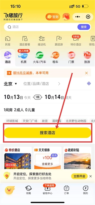 我们打开飞猪旅行首页,确定好入住时间等相关信息后,点击【搜索酒店】按钮,就可以开始查找酒店了。