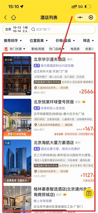 搜索后进入酒店列表页面,能看到北京华尔道夫酒店等多家酒店,若有想预订的,点击进入酒店详情页。