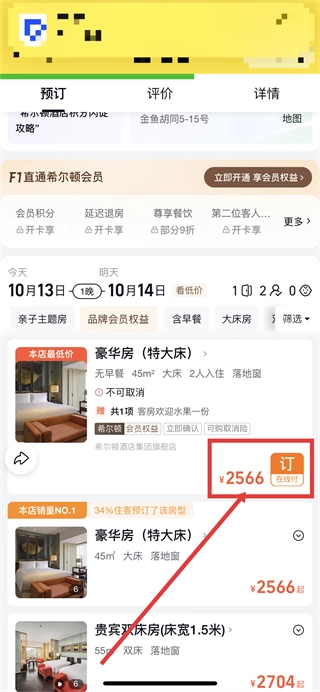 进入酒店详情页面后,先挑选合适的房型,像豪华房(特大床)这类,接着点击该房型对应的预订按钮就可以了。