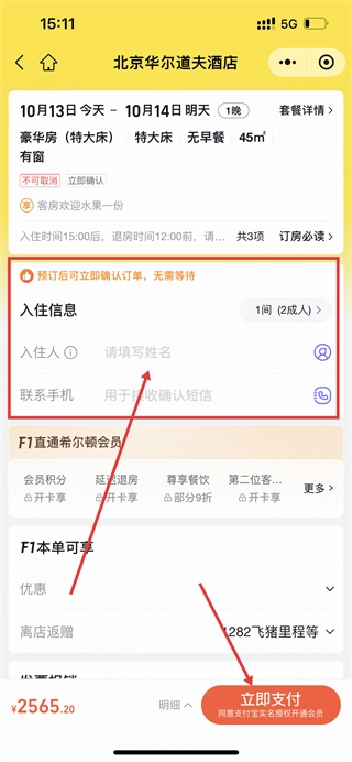 点击该按钮后跳转至预订界面,依次填写入住者姓名、联系电话等相关信息,随后点击【立即支付】按钮即可完成整个预订流程。