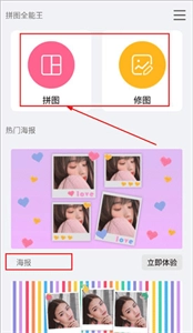 1、打开拼图全能王软件,该软件主要具备拼图、修图以及各类海报模板制作功能,之后点击拼图选项。