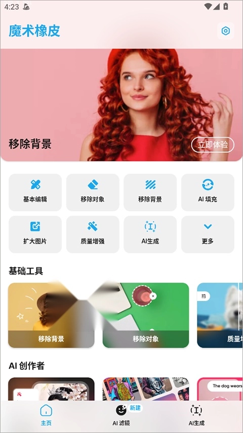 魔术橡皮是一款功能十分强大的图片处理工具,软件搭载了智能深度学习算法,能在处理图像时进行精确化扫描处理。同时,软件还有多种实用功能,包含了基本编辑、移除背景、扩大图片、质量增强、AI滤镜以及一句话生成AI图片等。
