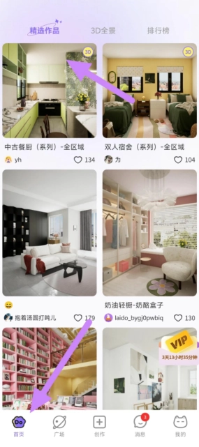 2、打开软件,点击首页下方可以看到很多软装作品。