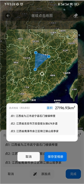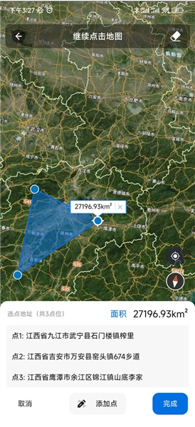4、测量面积的流程如下(以3个点举例,测量面积需要至少3个点位以完成区域闭合,您可自行添加更多点位)
