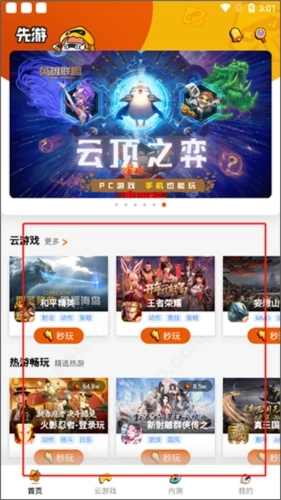1、点击打开先游h3云游戏,然后点击页面上的搜索框。