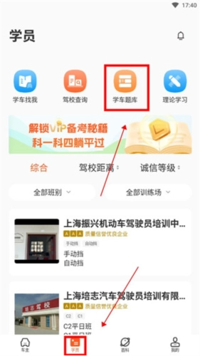 2、点击下方的【学员】板块,在学员板块中选择【学车题库】。