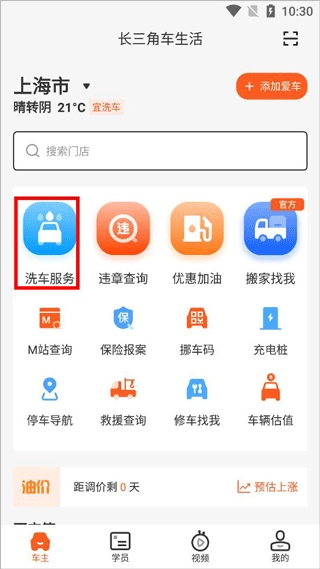 1、打开长三角车生活,有首页、学员、视频和我的版块,首页可以查看汽车服务以及附近汽配门店。