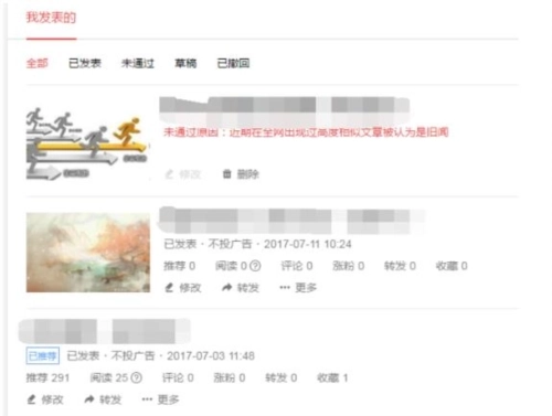5、内容管理,这是你在今日头条上面看你发表的内容是否被推荐,多少阅读量,给你带来了多少粉丝,多少人评论,转发,收藏。今日头条这个页面做的是很好的