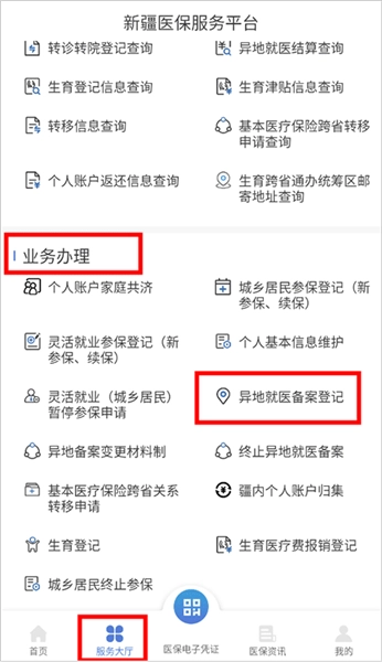 2、切换到服务页面,在业务办理类目下找到“异地就医备案登记”;