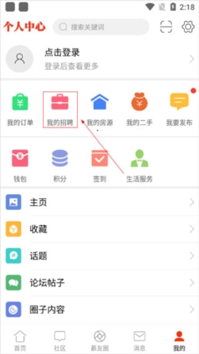 1、进入綦江在线的个人中心页面,点击“我的招聘”。