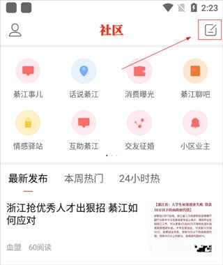1、打开綦江在线进入社区界面,点击右上角的发帖按钮。