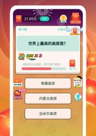 1.完成答题就能领取对应题目的红包,连续答对还有额外的红包可以领