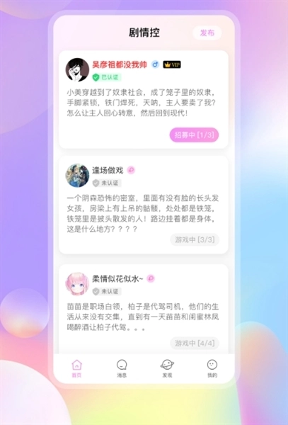 剧情控是一款由郑州一半科技有限公司所研发的剧本杀软件。软件将为用户带来志同道合的好友,体验原创的剧本,让用户感受线上的乐趣,享受不同剧本带来的故事,为你搭建身临其境的场景。所有的剧情走向都是采用文字的方式来渐进的。同时还可以支持用户进行原创剧本,在这个游戏中你就是最大的主角,还有众多优秀的剧本等待你去演绎,在这里你就是主角。