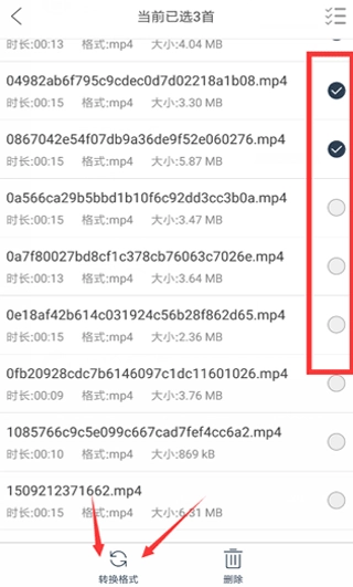 2、长按视频列表,进入批量管理页面,可以单选也可以多选,选择了视频之后,点击底下的“格式转换”按钮。