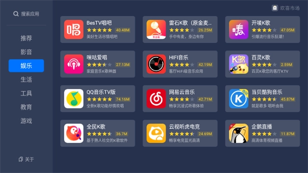欢喜市场是一款非常优秀的智能电视应用商店软件,这款软件应用资源丰富、应用更新及时,为用户提供了高速速服务,界面简洁易用、应用安全性高、兼容性强,用户可以放心使用。