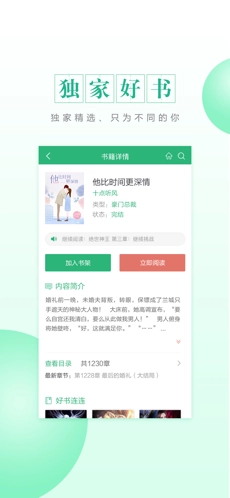 1、海量小说:百万小说随便看,玄幻奇幻、都市言情、武侠仙侠、青春校园、穿越架空、惊悚悬疑、历史军事、耽美同人、官场权势、职场竞技、科幻灵异、经典图书等各类小说应有尽有;更重要的是阅读全程,阅读体验一级棒。