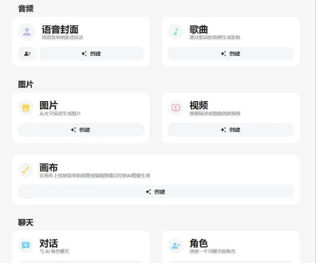 5、进入新页面后,我们能看到7款可免费使用的AI小工具,分别是:文生图、AI文生歌曲、AI文/图生视频、AI画布(实时绘画)、AI对话、AI对话智能体。