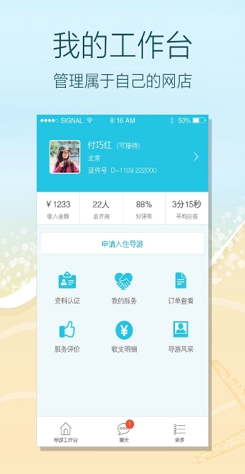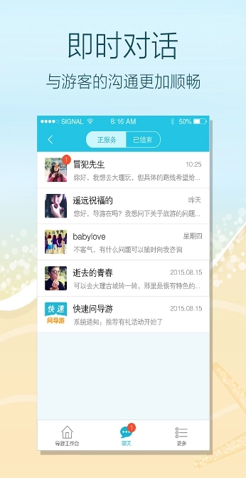 1、能快速与游客展开轻松便捷的沟通,可便捷查看当前服务及已完成的服务项目。