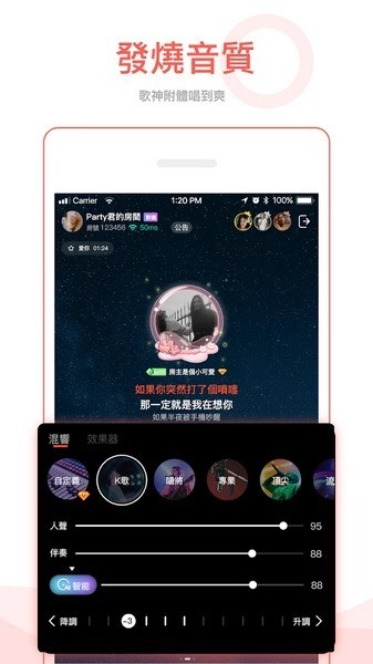 1、【高清音质,专业级别】平台拥有海量免费高清伴奏资源,支持随时随地在线卡拉OK。无论好友是否在身边,你都能畅快语玩、举办专属个人歌会、尽情K歌;还能通过“音乐直播”与乐迷零距离互动。此外,防麦霸模式、K歌弹幕等趣味玩法也一应俱全,带来新鲜体验。