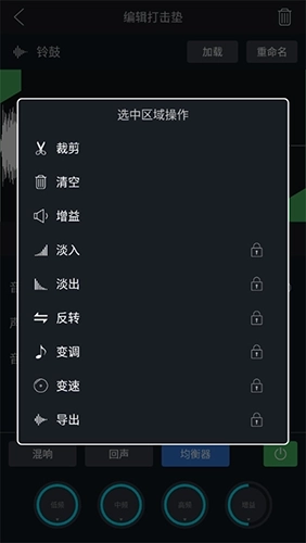 1、音频编辑方面:打击垫大师具备音频混音、变音、淡入淡出、快慢速调节等实用功能。