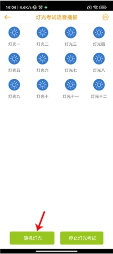5、以“灯光模拟”考试为例,在“练车”页面点击“灯光模拟”选项,就能进入对应的操作页面,此时按下随机灯光按钮,灯光考试便会启动。